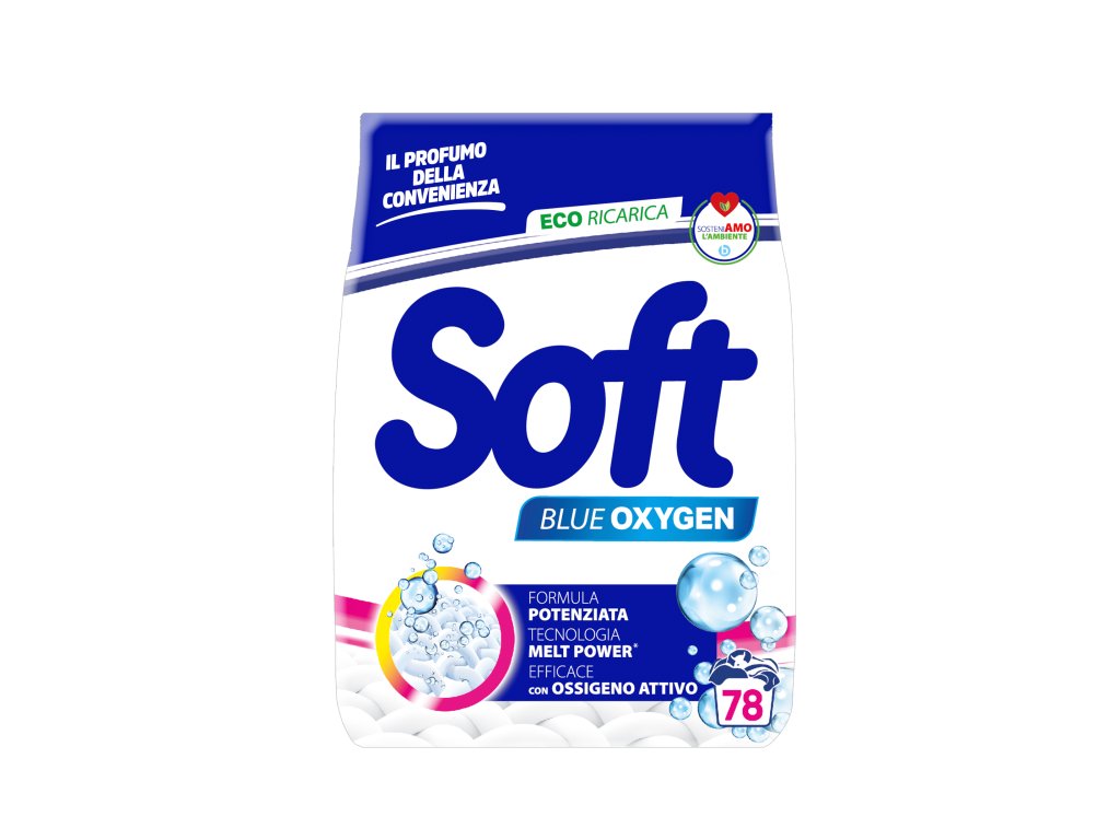 SOFT Detersivo in Polvere Lavatrice Blue Oxygen 78 M je moderní prací prostředek vyráběný procesem věžové atomizace, který zaručuje rychlou a rovnoměrnou rozpustnost i ve studené vodě. Aktivní kyslík působí jako silný odstraňovač skvrn, enzymy rozkládají organické nečistoty a optické zjasňovače obnovují svěžest a zářivost prádla. Nová posílená formule s aktivátorem bělidla zajišťuje ještě vyšší účinnost proti odolným skvrnám.