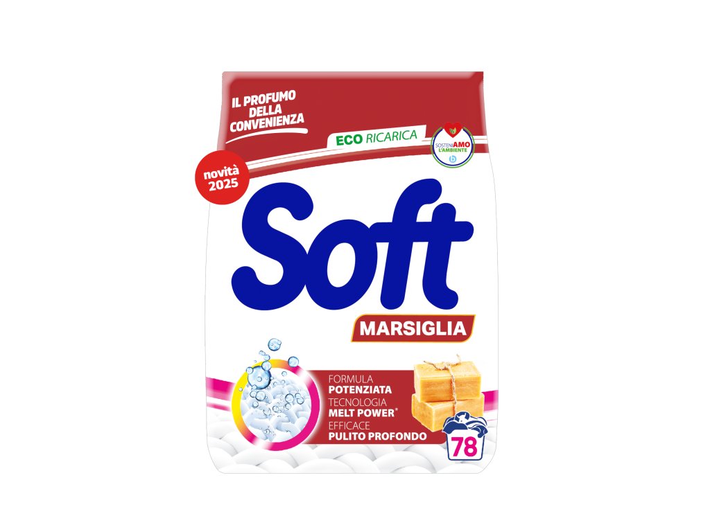 SOFT Polvere Lavatrice Marsiglia je vysoce účinný prací prostředek vyrobený speciální technologií věžové atomizace, která zaručuje rychlé a úplné rozpuštění i při nižších teplotách. Díky obsahu aktivního kyslíku, enzymů a tradičního mýdla Marsiglia odstraňuje i odolné skvrny, obnovuje svěžest vláken a zanechává prádlo hygienicky čisté s jemnou vůní přírodního mýdla.